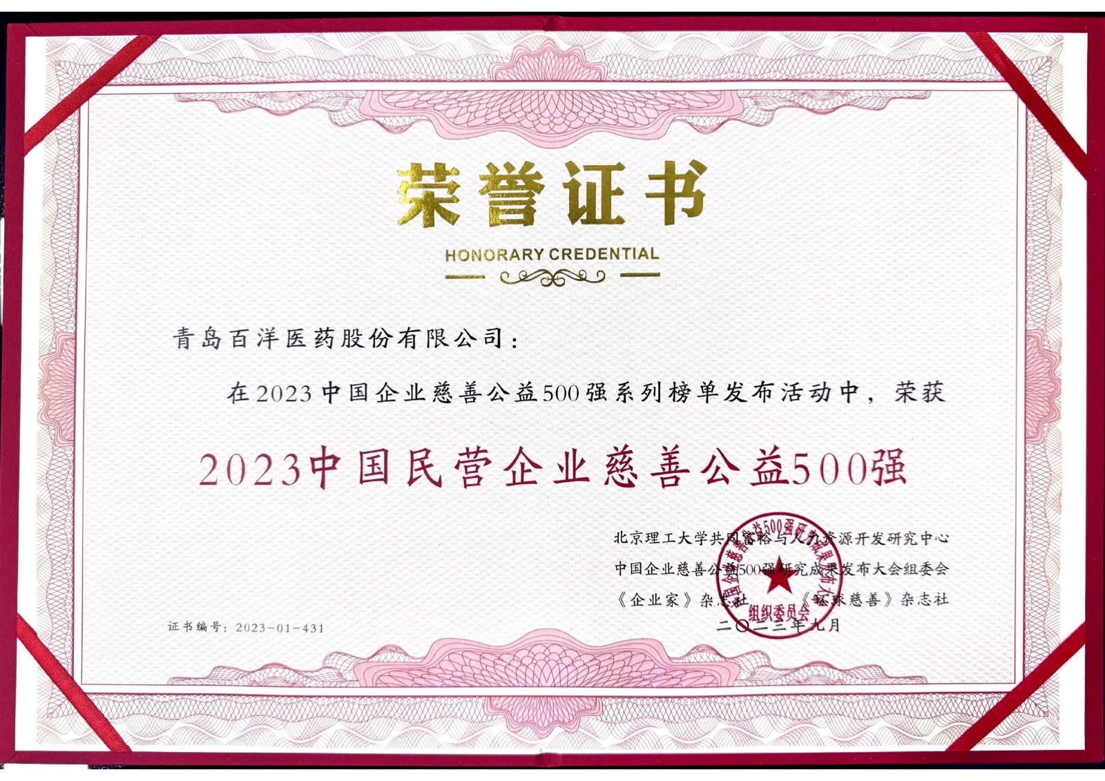 本届大会由北京理工大学共同富裕与人力资源开发研究中心、中国企业慈善公益500强研究成果发布大会组委会、鹤壁市人民政府等单位联合主办。此次大会以“财富与责任——企业的价值”为主题,旨在促进中国慈善公益事业、中国企业高质量发展,形成以业载善、以善兴业的良性循环。会上发布的“ 2023 中国民营企业慈善公益 500 强”系列榜单向全社会全面客观展示了中国民营企业慈善公益新成就。